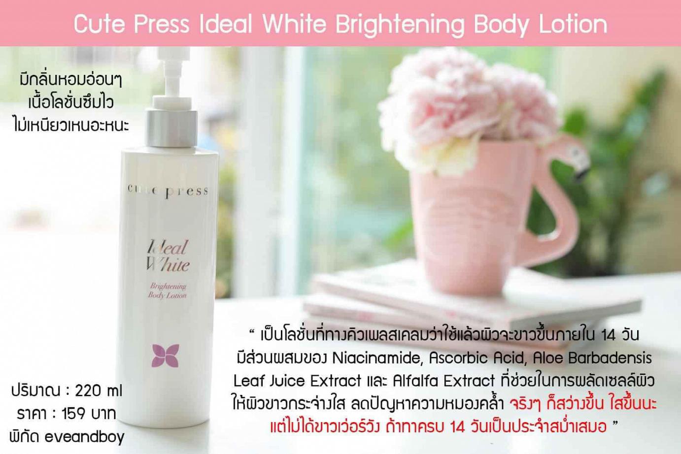 Lotion được Cute Press Ideal quảng cáo cho hiệu quả làm trắng trong vòng 14 ngày, có thành phần gồm Niacinamide, Ascorbic Acid, Aloe Barbadensis Leaf Juice Extract và Alfalfa Extract giúp tái tạo da làm da trắng sáng, giảm các vấn đề về thâm nám. Nếu dùng em này đủ 14 ngày đều đặn thì vẫn có hiệu quả trắng sáng, tuy nhiên không bật tông quá nhiều.